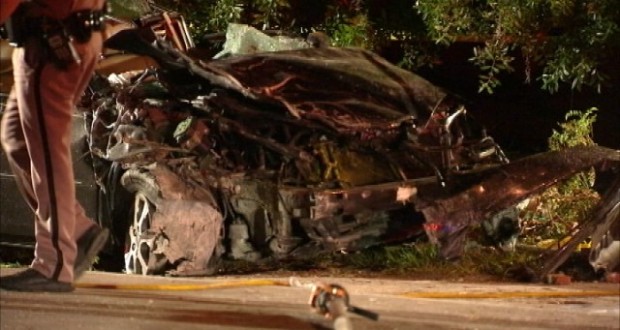 Officials say the car flipped over and hit a brick wall.